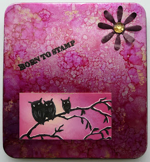 This tin box was a lot easier to do than the previous one. I just let the gorgeous alcohol ink colours do their magic. The piece of stampord was sponged with coordinating colours dye ink and stamped on with black Stazon. I used a sharp knife to scratch away some ink to let the white clay show through.