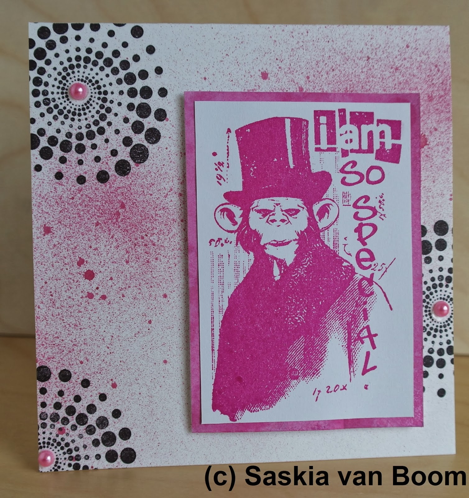 Deze kaart had ik gemaakt vóór de operatie maar wou ik toch nog even laten zien. De stippenstempel is van Judikins, de aap komt bij Katzelkraft vandaan.